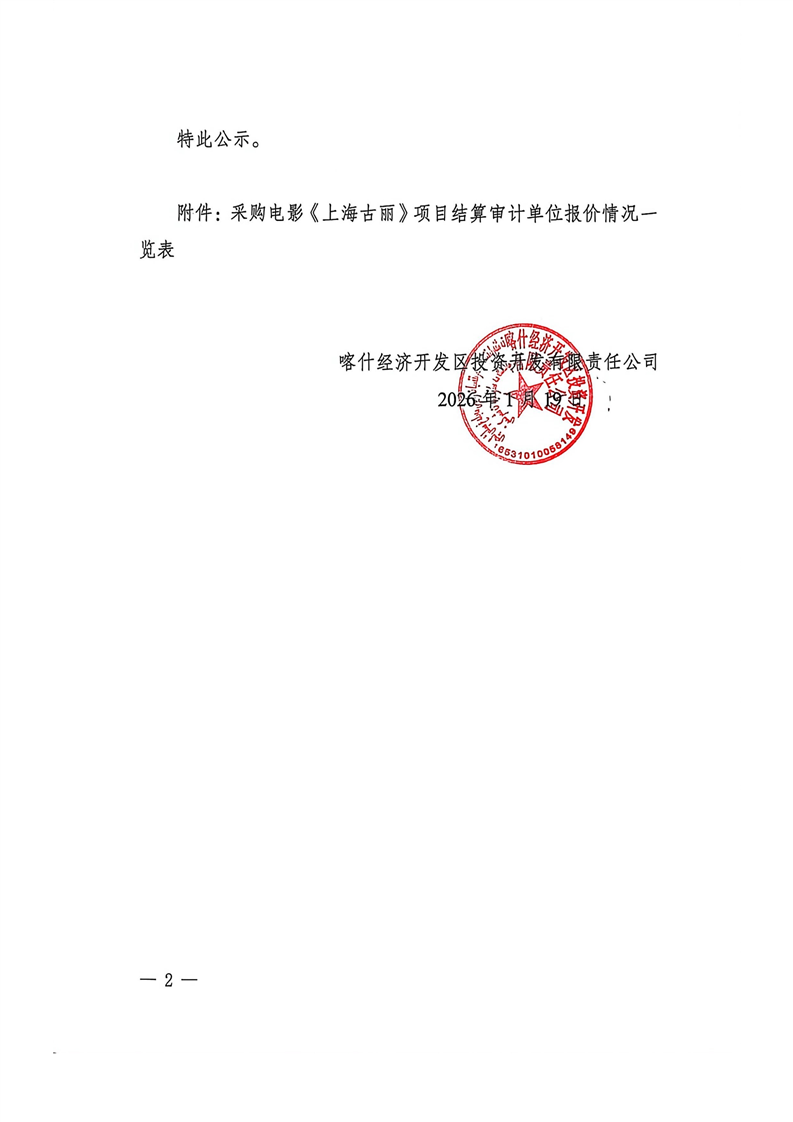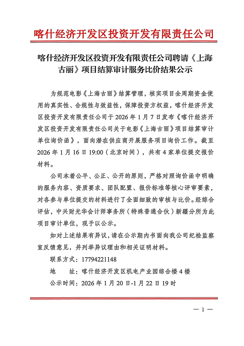 喀什经济开发区投资开发有限责任公司聘请《上海古丽》项目结算审计服务比价结果公示